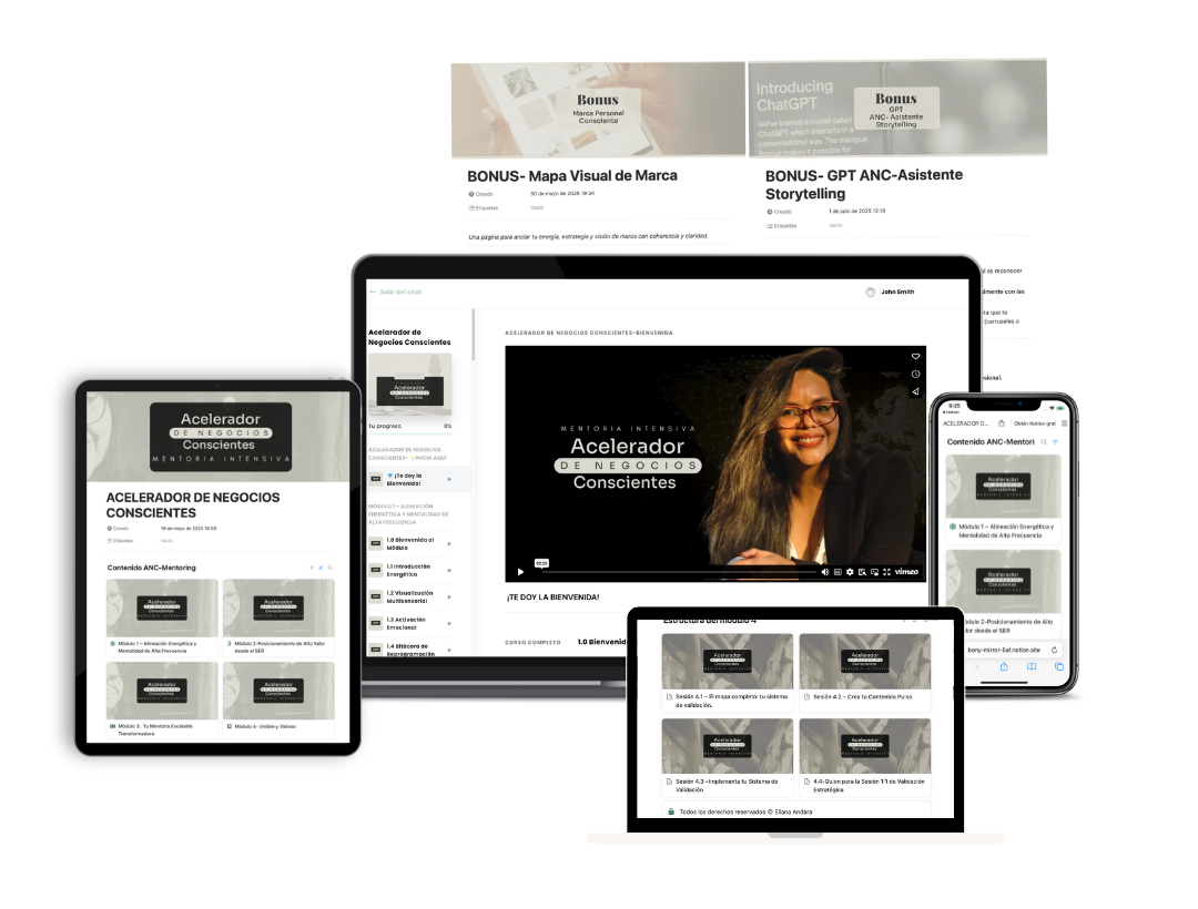 La primera edición del Acelerador de Negocios Conscientes incluye acceso en tiempo real a todo el proceso de creación y validación de tu programa, además de recursos premium diseñados para potenciar tu claridad, enfoque y acción.