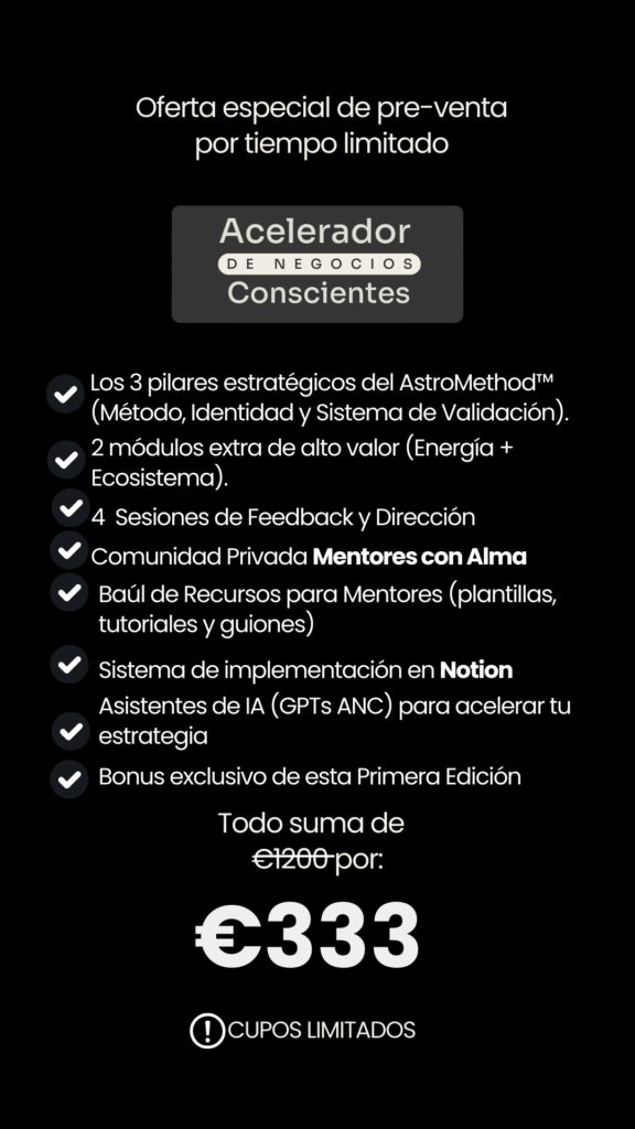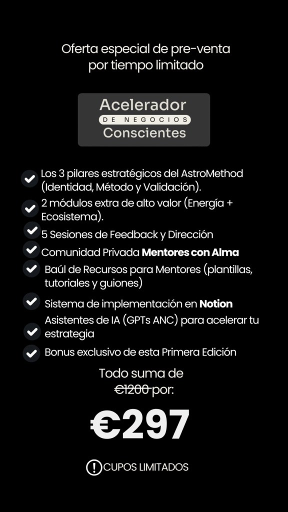 Con «El Acelerador de Negocios Conscientes», no solo aprenderás herramientas prácticas, sino que también trabajarás en ganar claridad y confianza para diseñar un negocio que trascienda la idea de un hobby y se convierta en una estructura sólida y sostenible.