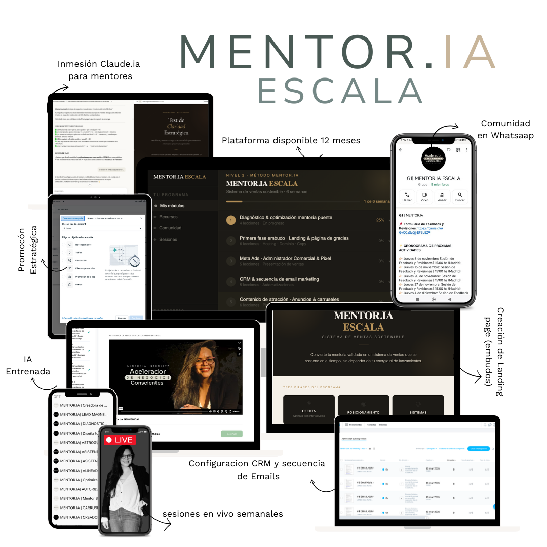 En MENTOR.IA ESCALA no enseño fórmulas universales ni modelos agresivos. Acompaño a convertir mentorías que ya existen en sistemas de venta coherentes, sostenibles y alineados, para que el negocio funcione sin exigir presencia constante ni desgaste.